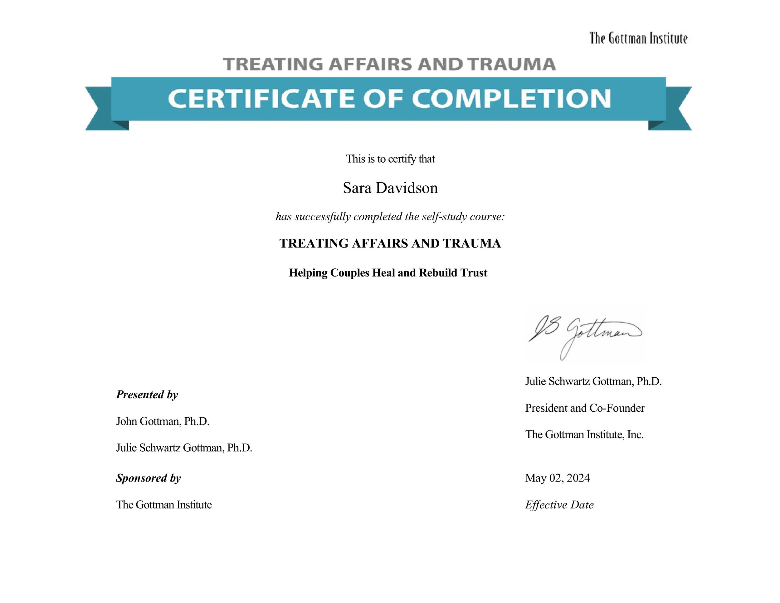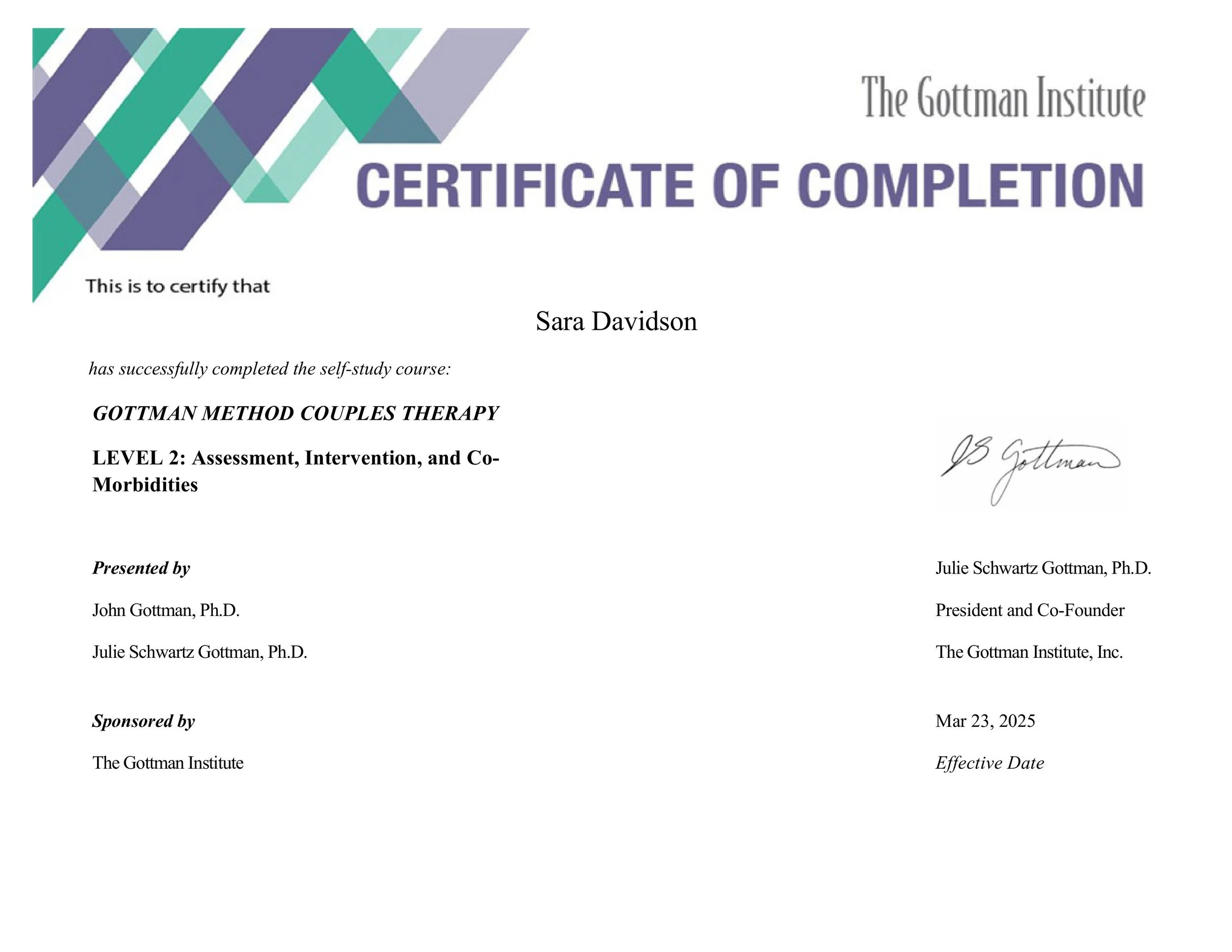 I hold Level 1 and Level 2 certifications in the Gottman Method, based on over 40 years of leading research in relationship psychology. I’m also completing my certification through the World Coach Institute (WCI), accredited by the International Coaching Federation (ICF), as both a Certified Professional Coach and a Certified Relationship Coach. In addition, I am currently pursuing a Master’s degree in Clinical Psychology with a focus on Marriage and Family Therapy in the United States.